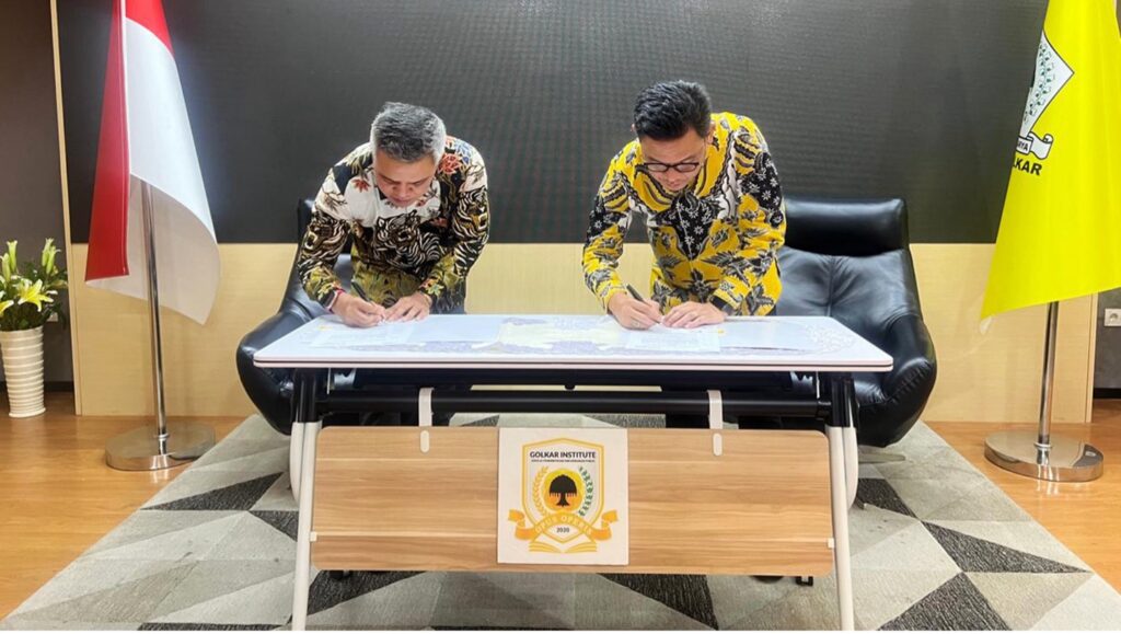 Tampak Ketua Perkumpulan Mandala Katalika Juliarta Bramansa Ottay bersama dengan Ketua Dewan Pengurus Golkar Institute, Dr.TB.H. Ace Syadzily, M.Si sedang melakukan proses penandatanganan kerjasama.