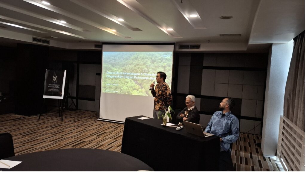 Dalam sesi penjelasan mengenai desain studi kelembagaan dan operasional program iklim oleh Bapak Embun Bunyana dan Tomi Ariyanto dari Mandala Katalika, dijelaskan bahwa tujuan studi ini adalah untuk mendapatkan gambaran mengenai struktur organisasi pengelolaan program iklim, mencatat proses bisnis, serta memberikan masukan dalam penyusunan kebijakan pemerintah mengenai pengelolaan program iklim. Studi kelembagaan ini akan melingkupi empat poin yaitu, kelembagaan dan tata Kelola, mekanisme perancangan program dan perencanaan, mekanisme pembagian manfaat dan sistem monitoring, reporting dan verifikasi (MRV). Studi kelembagaan ini juga memiliki delapan poin yang akan dianalisa, diantaranya struktur kelembagaanm mekanisme perencanaan, mekanisme pengambilan Keputusan, mekanisme pelaksanaan, mekanisme distribusi benefit, sistem monev, keterlibatan pemangku kepentingan dan acuan standar dan regulasi dimana studi ini rencananya akan dilaksanakan selama 6 bulan di kota Jambi dan Kalimantan Timur.