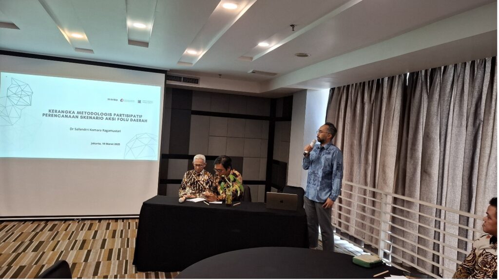 Dalam presentasi kedua, Dr. Safendrri Komara Ragamustari memaparkan kerangka metodologis yang akan digunakan dalam perencanaan skenario aksi FOLU di daerah. Metode yang digunakan menganut konsep La Prospective yang dikembangkan oleh Michael Godet, dengan prinsip Multi Criteria Assessment (MCA) dan pendekatan partisipatif terintegrasi, dengan menggunakan tools MICMAC, MACTOR, dan MULTIPOL.